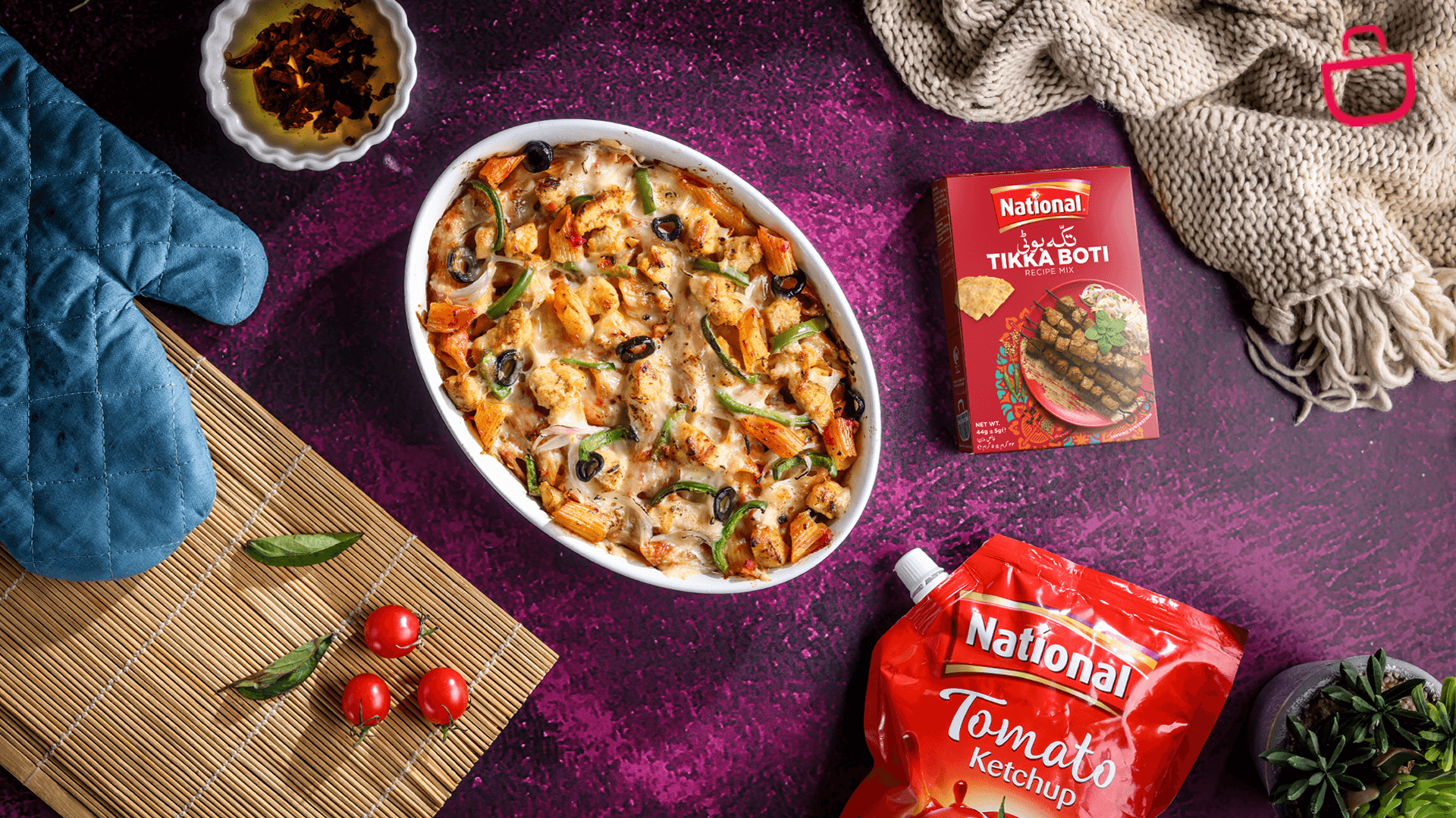 Heat oil in another pan, sauté onions for about 1 minute. Then add garlic, cook for the next 30 seconds followed by adding tomato puree, National Tikka Boti Masala, chicken powder, oregano, basil leaves, chopped olives, national chili garlic sauce, and cook for a further 7 to 8 minutes on low flame. (Check salt, if required add to taste.)