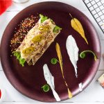 Roll up tightly into a cigar shape, insert tooth pick where necessary and lay tortilla on a baking tray.