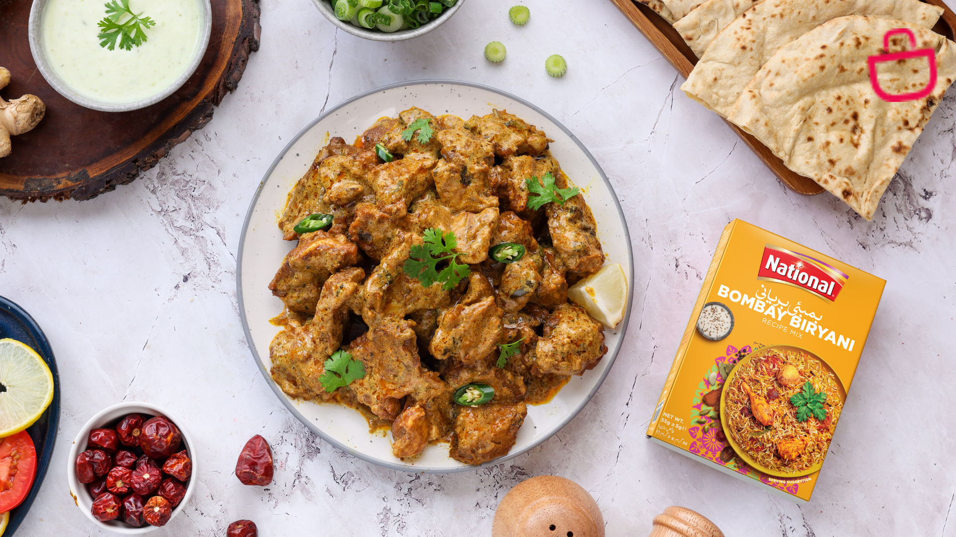 • Marinate mutton with ginger, garlic and National Bombay Biryani Masala and put in fridge for 2 hours.