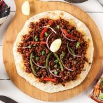 Baked to perfection, this thin & crispy Turkish Lahmacun pizza, topped with a palatable mixture of ground beef, onions, garlic, peppers, tomato; with extra flavorful tastes brought out by National Chicken Tikka Masala.