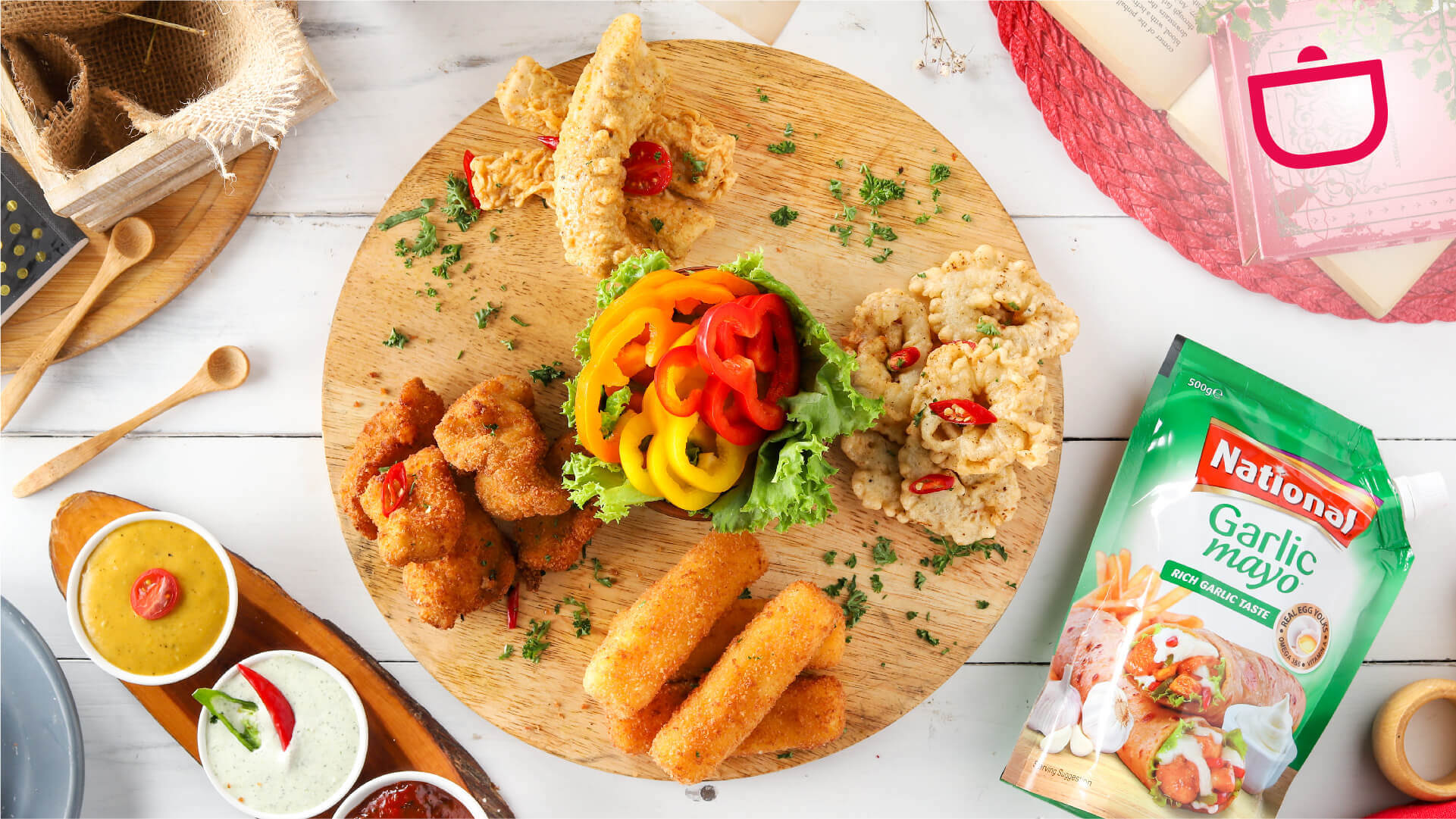 Get the best of all flavors and diversity in this appetizing Variety Platter. Mozzarella Sticks, Crispy Calamari, Crispy chicken, Popcorn chicken enjoyed best with Honey Mustard, Marinara, and Ranch dips, prepared with National Classic Mayo, National Tomato Ketchup and National Chili Garlic Sauce.