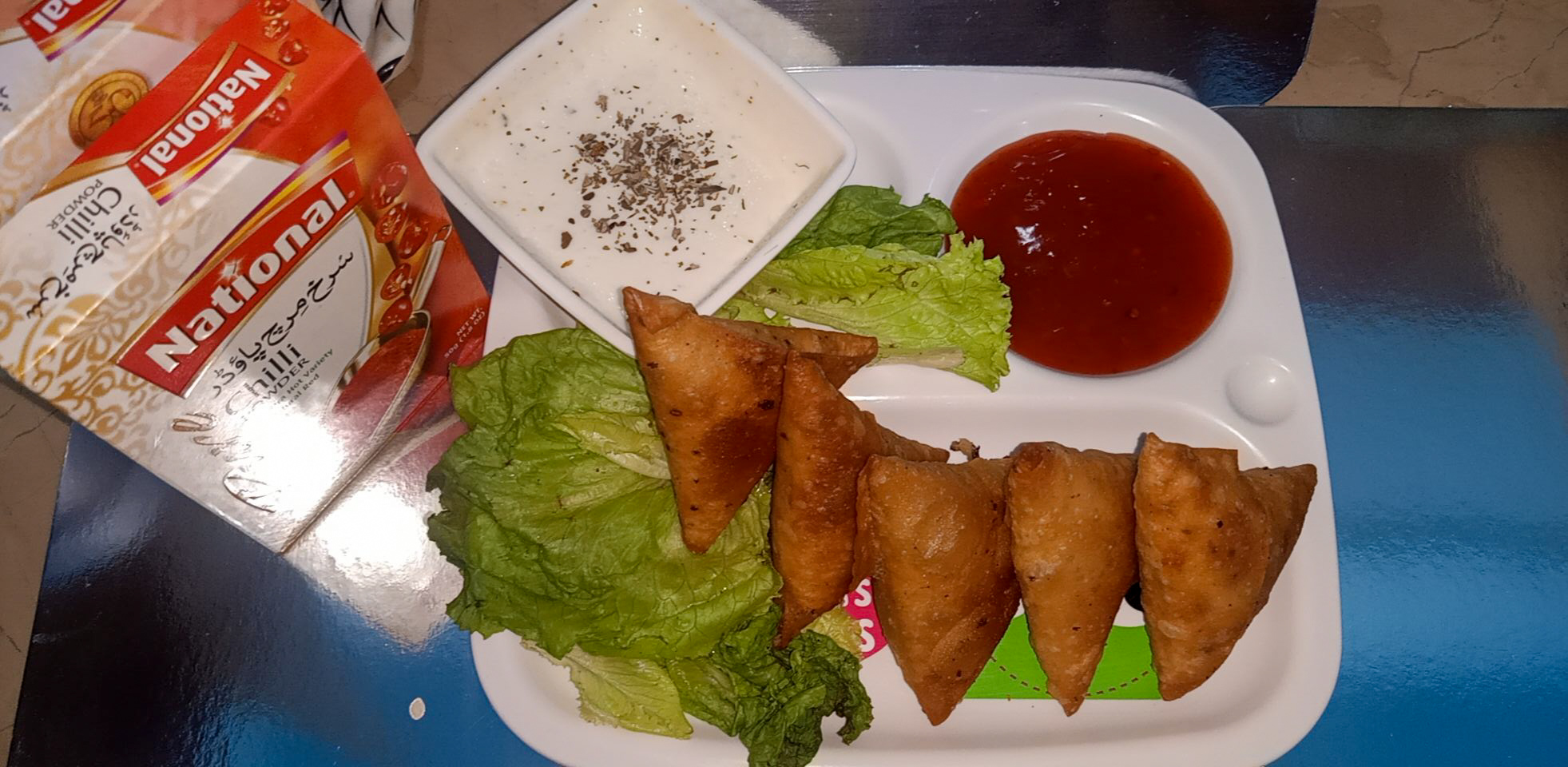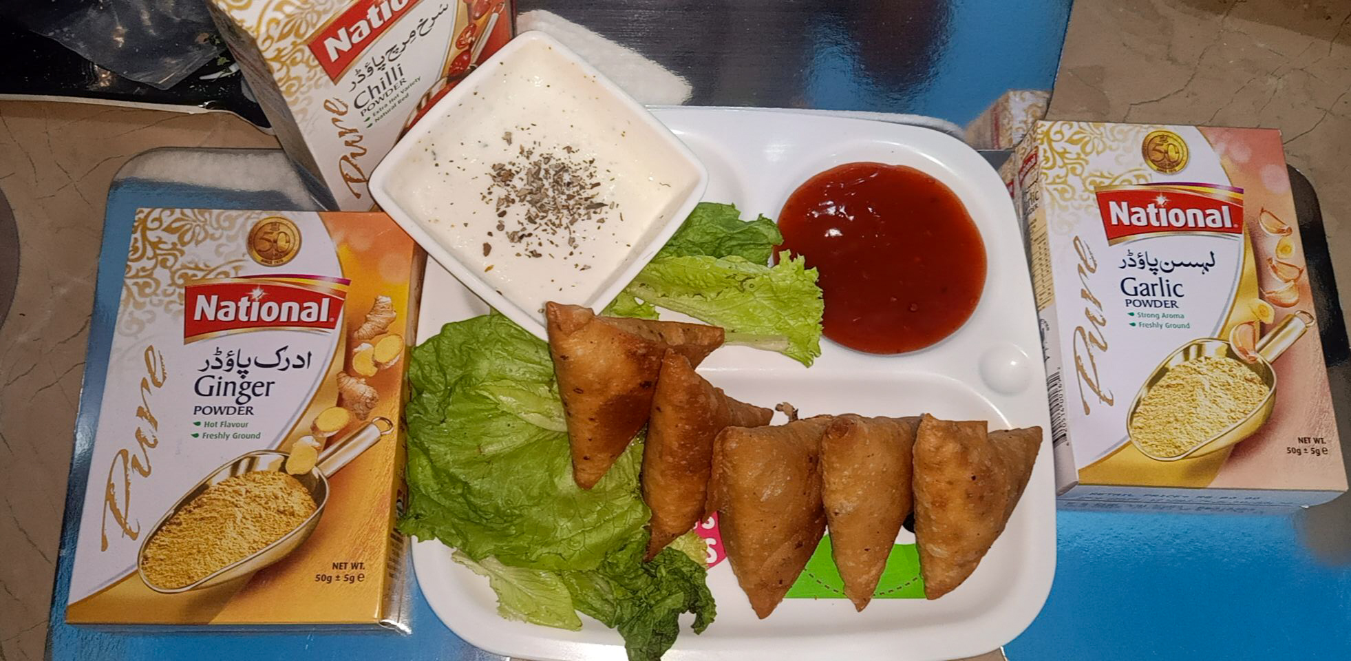 In a pan add oil chicken mince, National Tikka masala, National red chili powder, GG powder, and National salt and cook till the water evaporates, then set aside.Now take a bowl, add all-purpose flour with water and make a thick paste.Now add oregano, olives, jalapenos, and mushroom to the chicken mixture and give it a good mix.Now take a samosa sheet and fill your samosa bind with the help of the paste and set aside.Samosa is ready for deep fry.